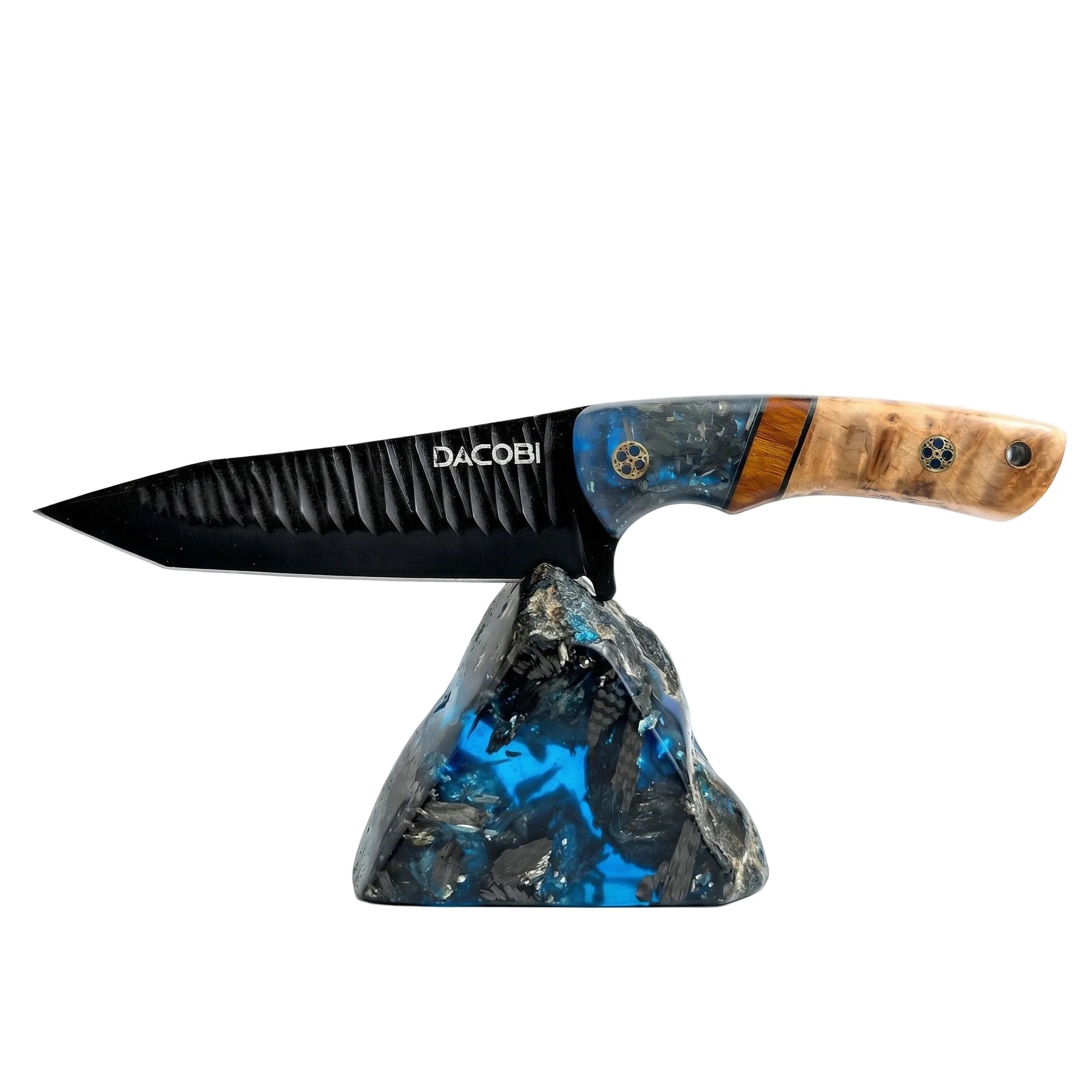 - Materiał rękojeści: sękate drewno + pustynne drewno żelazne, kolorowa żywica + węgiel